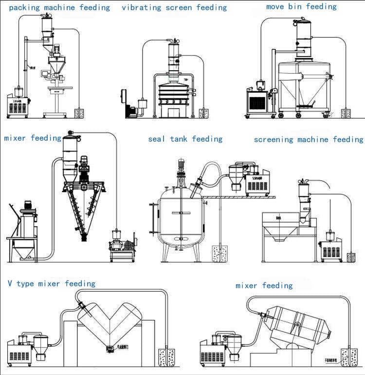 給料管開始吸料時(shí)按下給料開關(guān),當(dāng)吸料過程完成時(shí),振動(dòng)裝置振動(dòng)或反沖洗裝置反吹,防止堵塞過濾器。