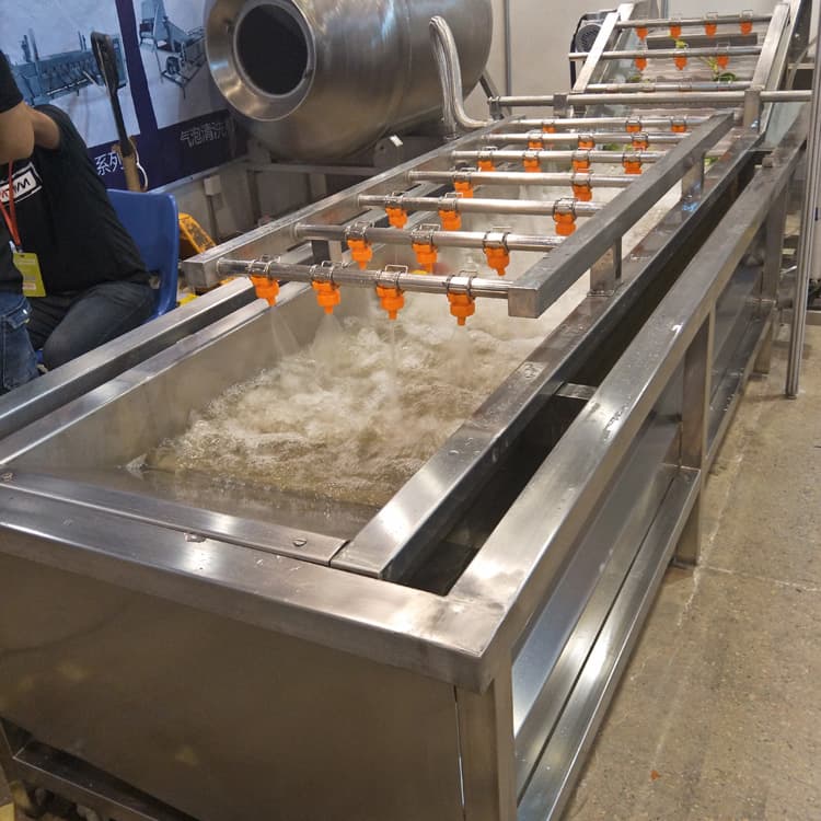 氣泡清洗機(jī)是將蔬菜水果,采用高壓氣泡水浴沖擊下,使物料在水里翻轉(zhuǎn),有效地分離蔬菜表面的泥沙、雜質(zhì)、污物,水流的大小可以控制,清洗下來的污物,經(jīng)濾網(wǎng)被攔截,而清潔干凈的果蔬,由蔬送帶提升進(jìn)入下一個工序,而在提升過程中再次被噴淋清洗。工作過程中,進(jìn)水管和噴淋水管始終供水,使水箱內(nèi)的污水逐步被替換。